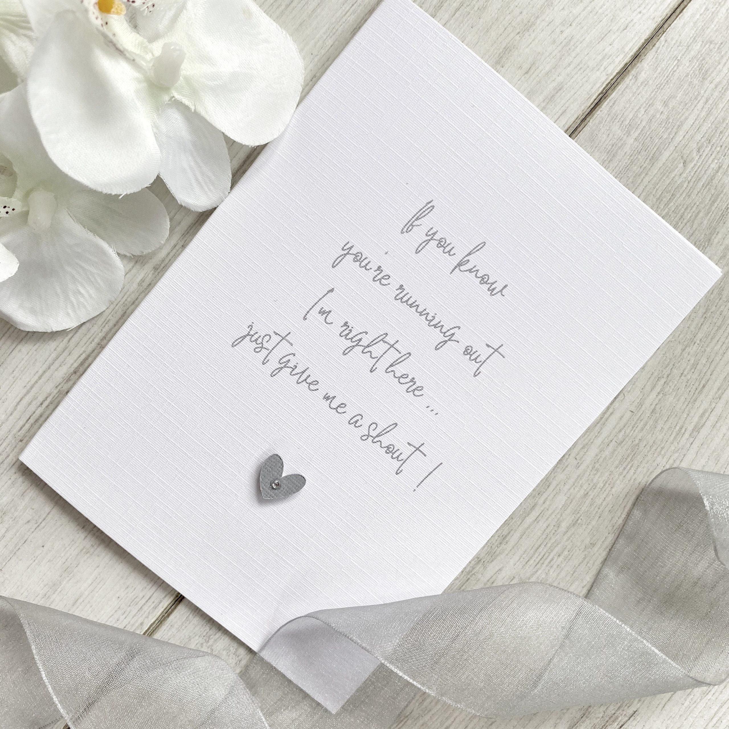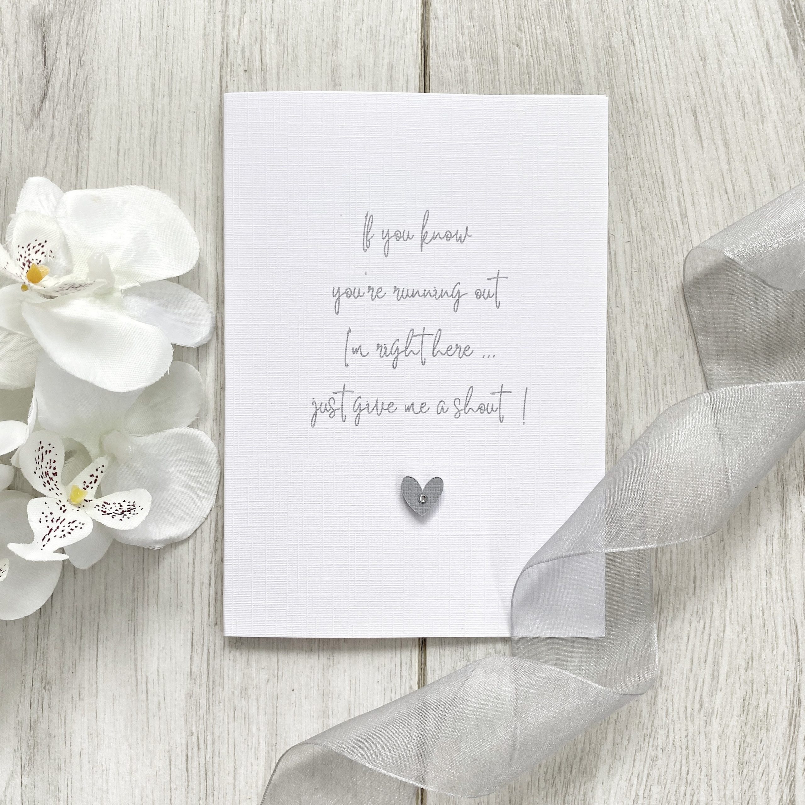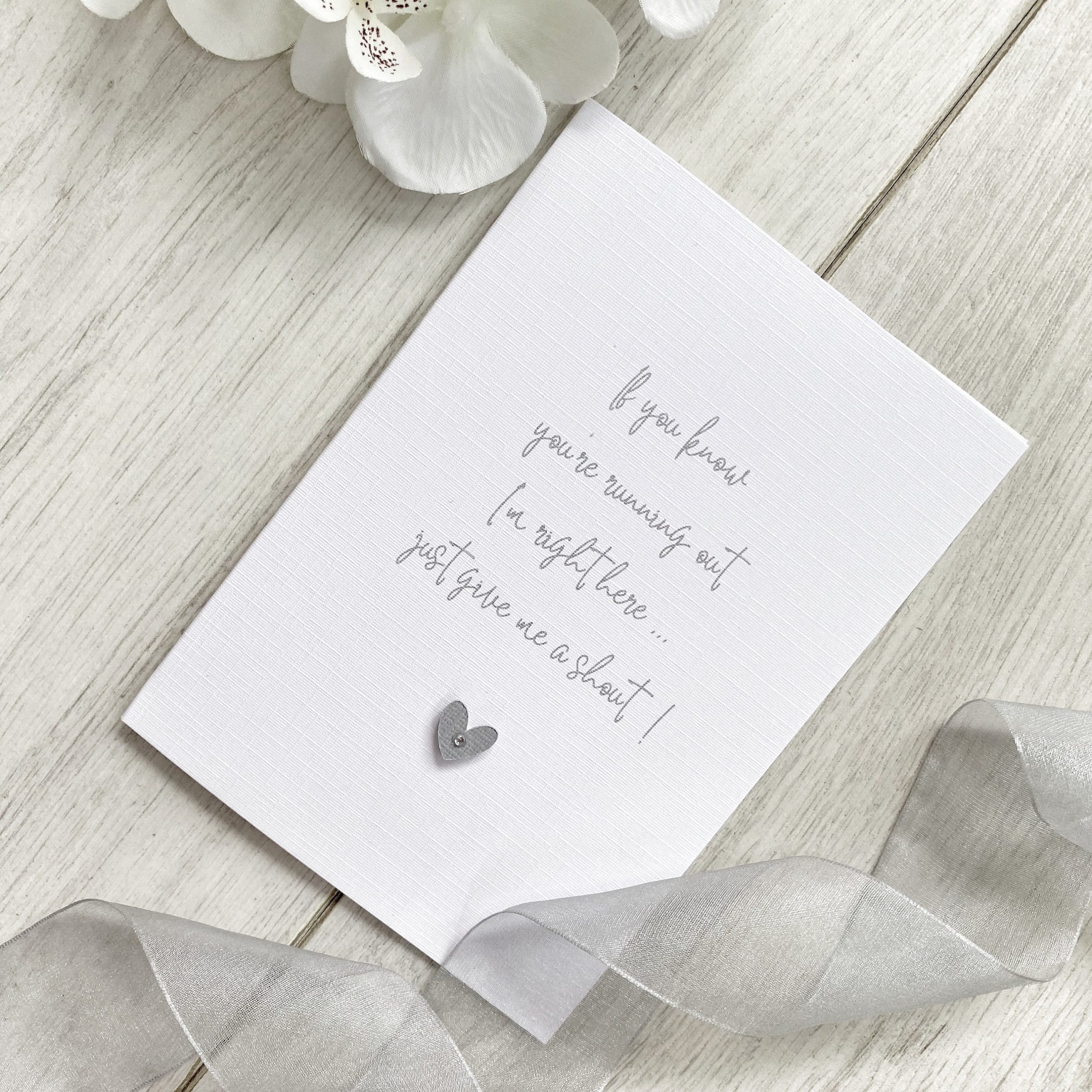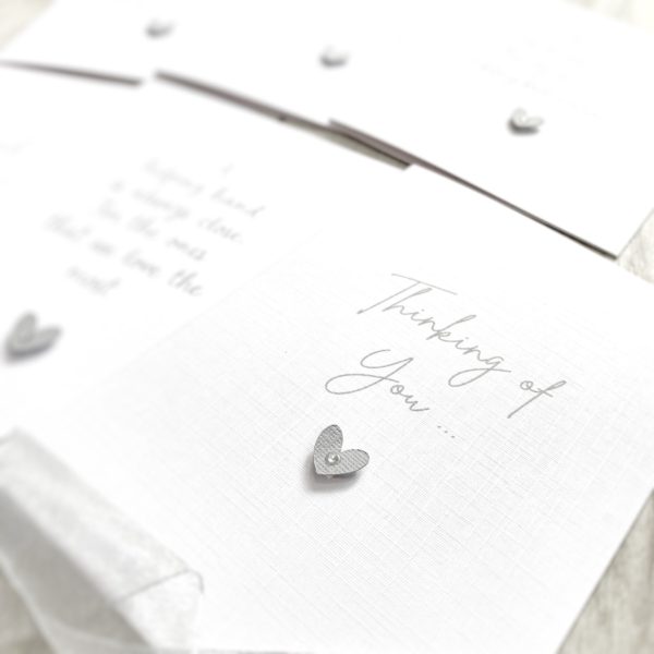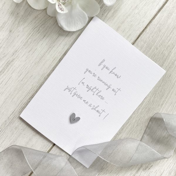 ◆ Printed in grey font and embellished with grey textured colour coordinating card heart on a raised pad with a little silver gem in the heart.