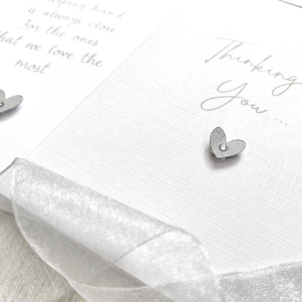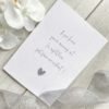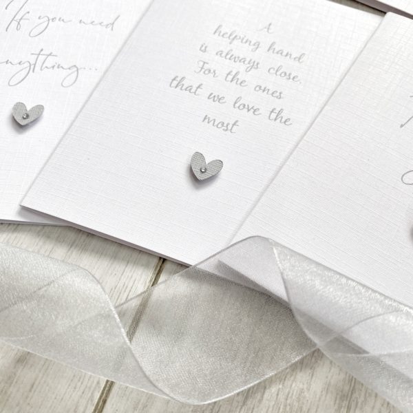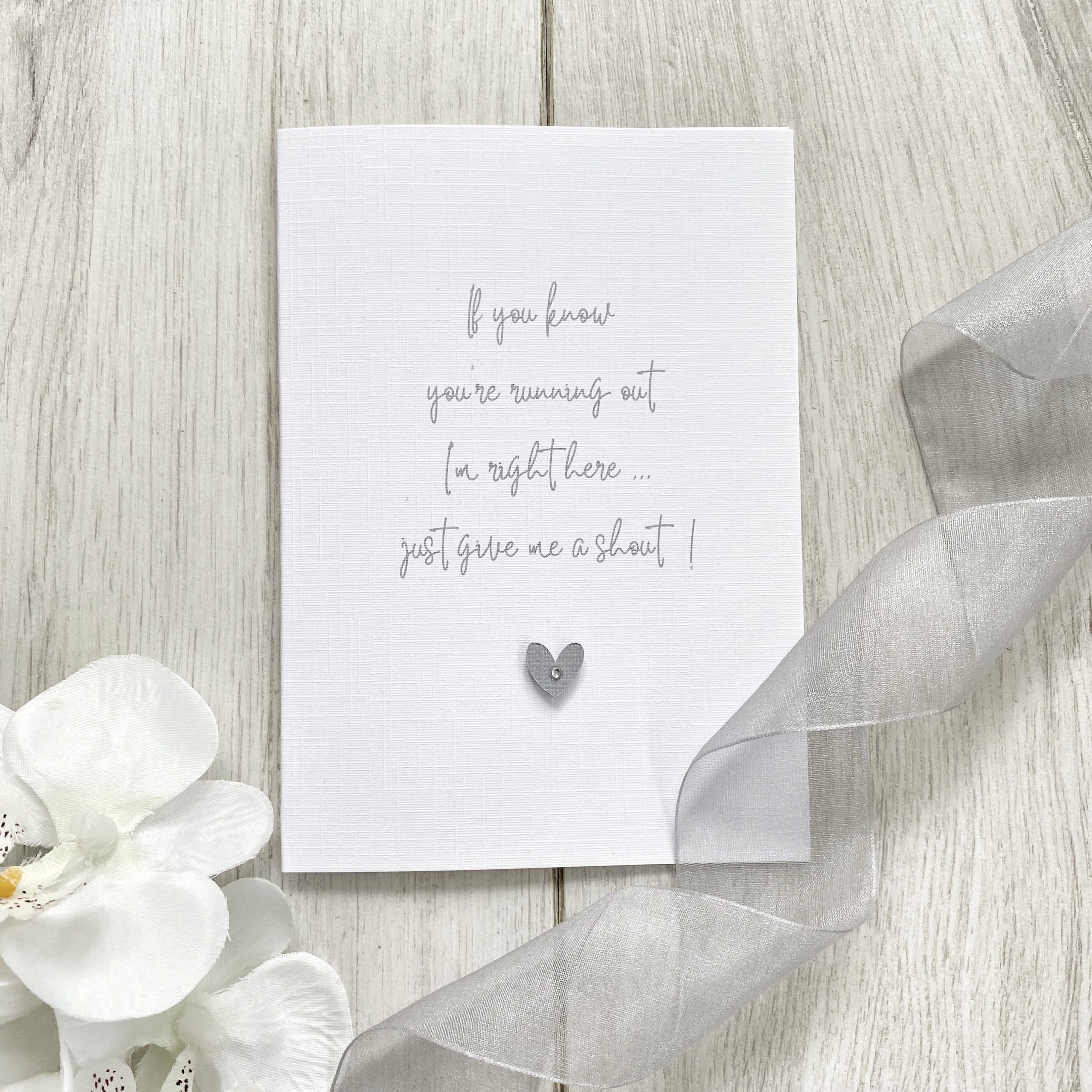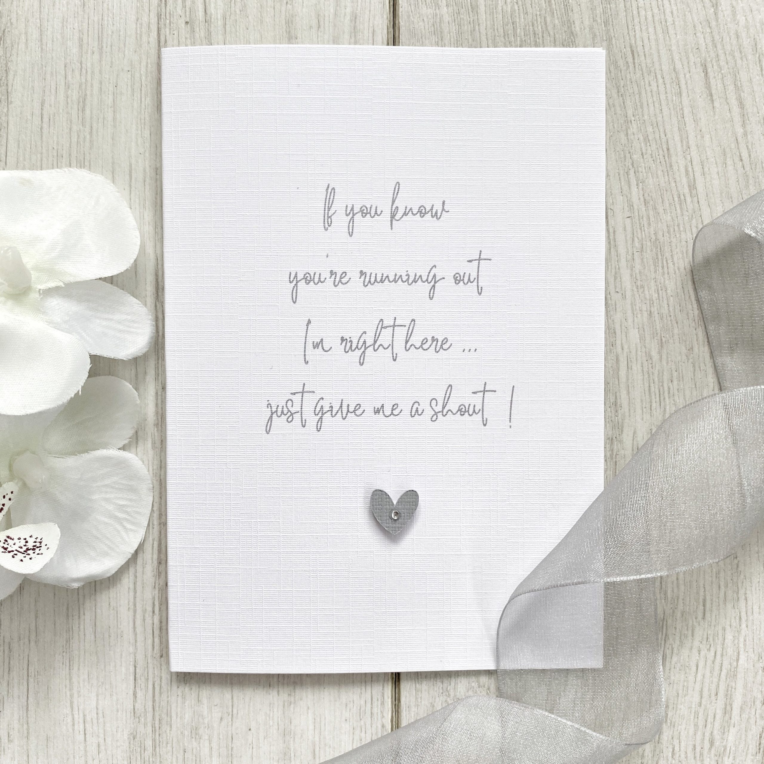 ◆ Printed in grey font and embellished with grey textured colour coordinating card heart on a raised pad with a little silver gem in the heart.