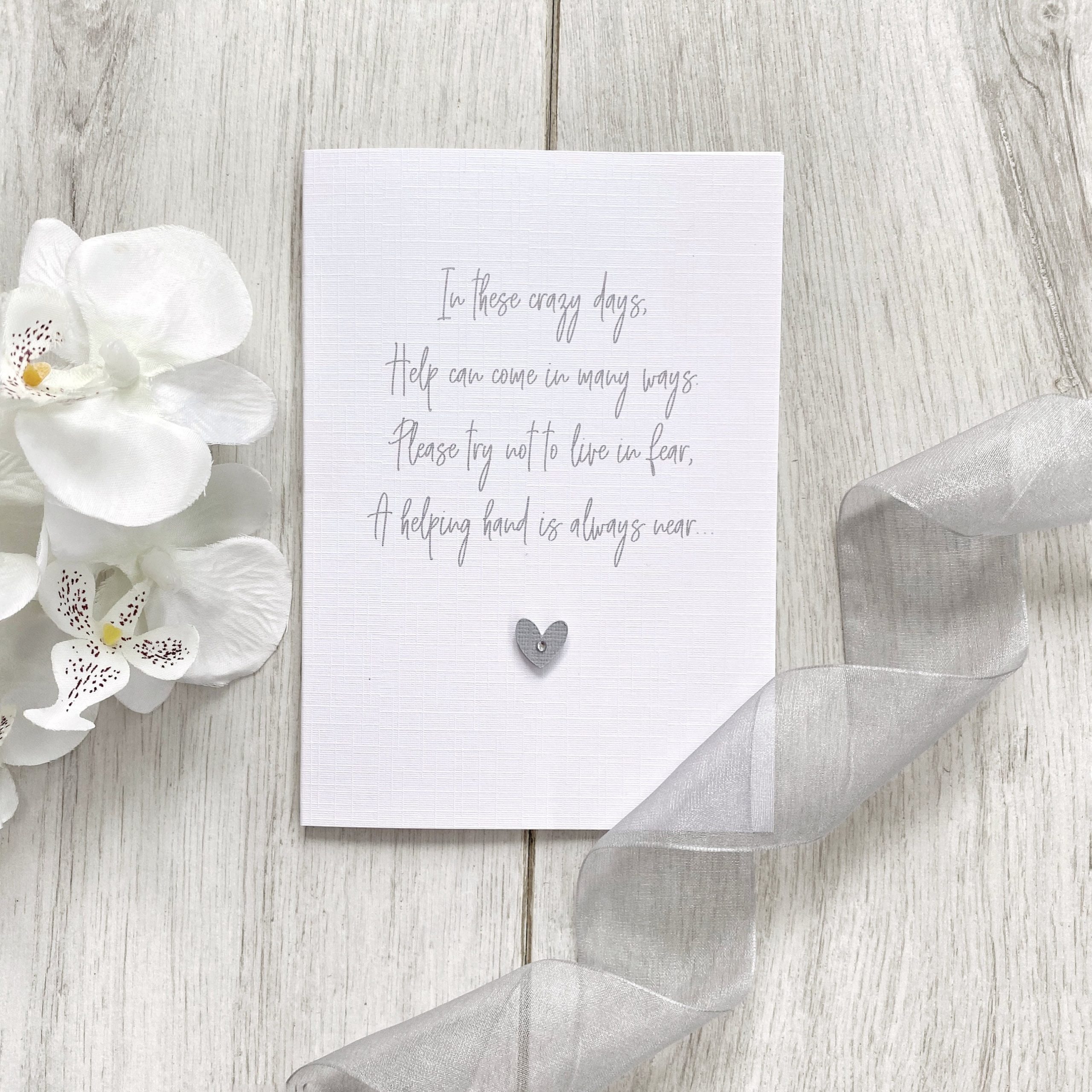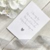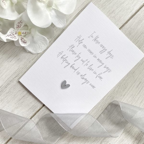 ◆ Printed in grey font and embellished with grey textured colour coordinating card heart on a raised pad with a little silver gem in the heart.