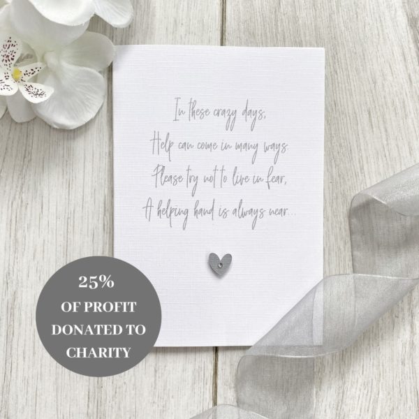 For each of our cards in our kindness range that is purchased, you are helping keep a small independent business operating during this turbulent time but we also want to give something back to our community too…so we will be donating 25% of the profit from card (or pack) to Charity.
