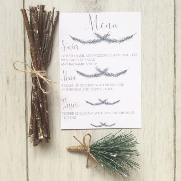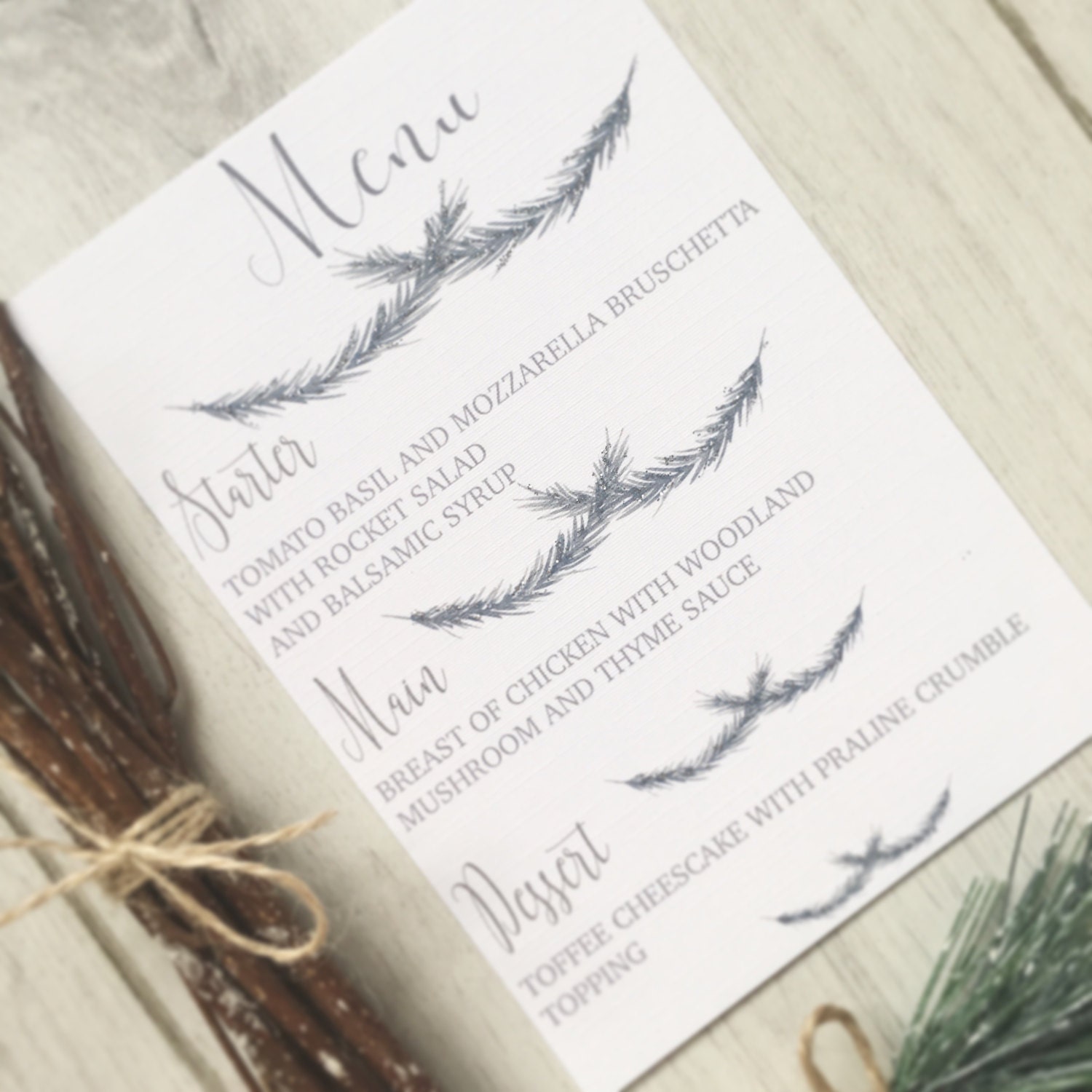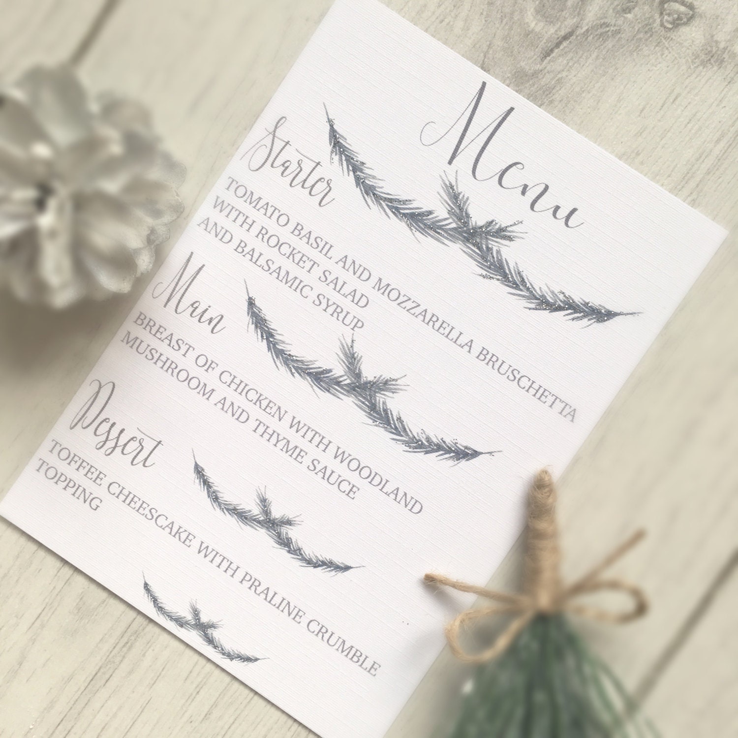 A beautiful Menu to match the Green Fir Style Wedding Invitations and will compliment a rustic winter wedding Greenery theme perfectly.