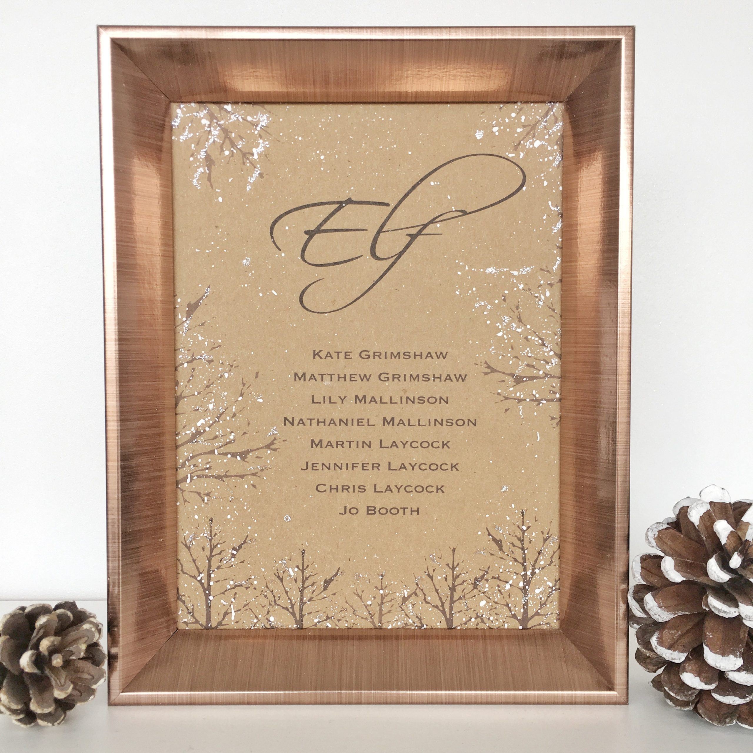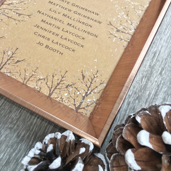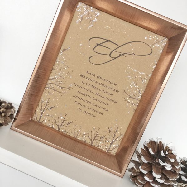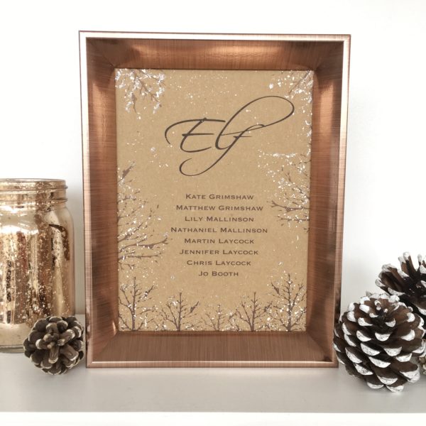 This is both printed, hand painted and delicately hand glittered on beautiful 300gsm Kraft Card to add that touch of rustic charm to a Winter Themed Rustic Wedding.