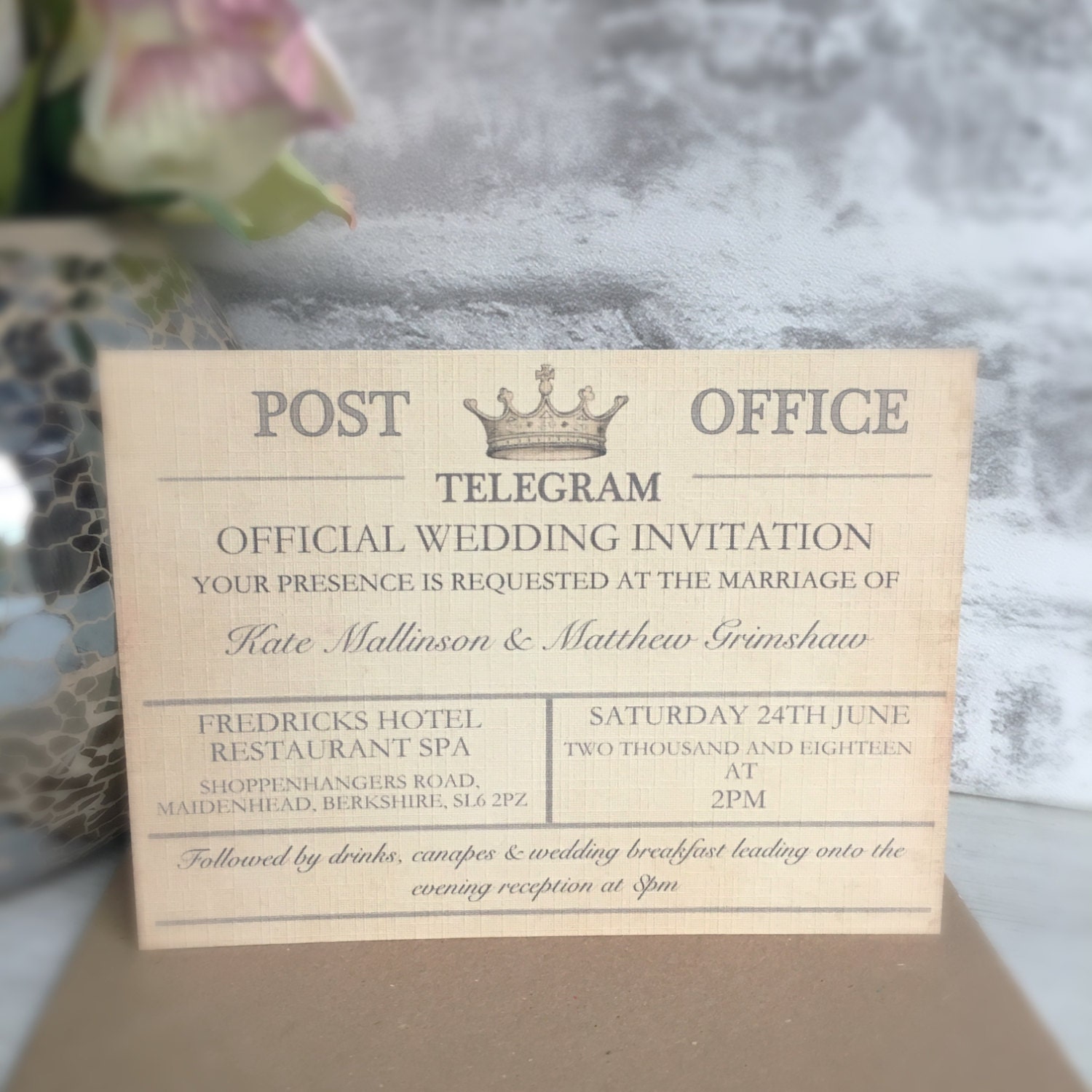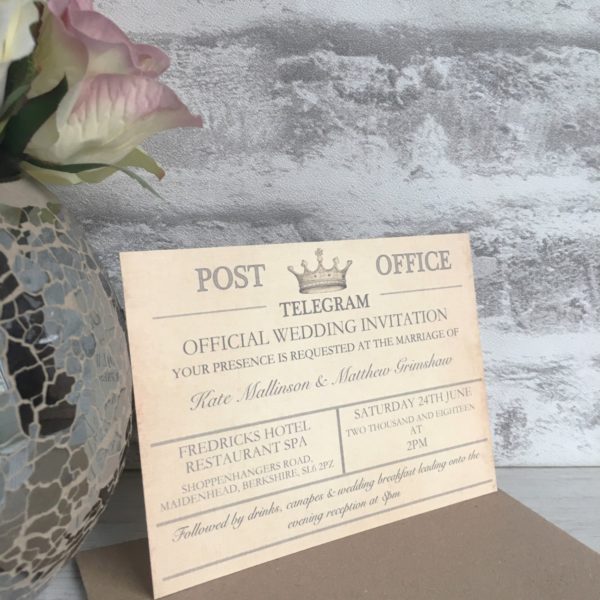 Purchase a sample of our Beautiful Vintage Wedding Telegram Style Wedding Invitation Suite.