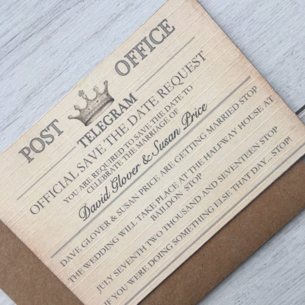 Part of the Vintage Telegram Wedding Suite, presenting our Save the Date Cards. This also makes an ideal Destination Wedding Save The Date Card.