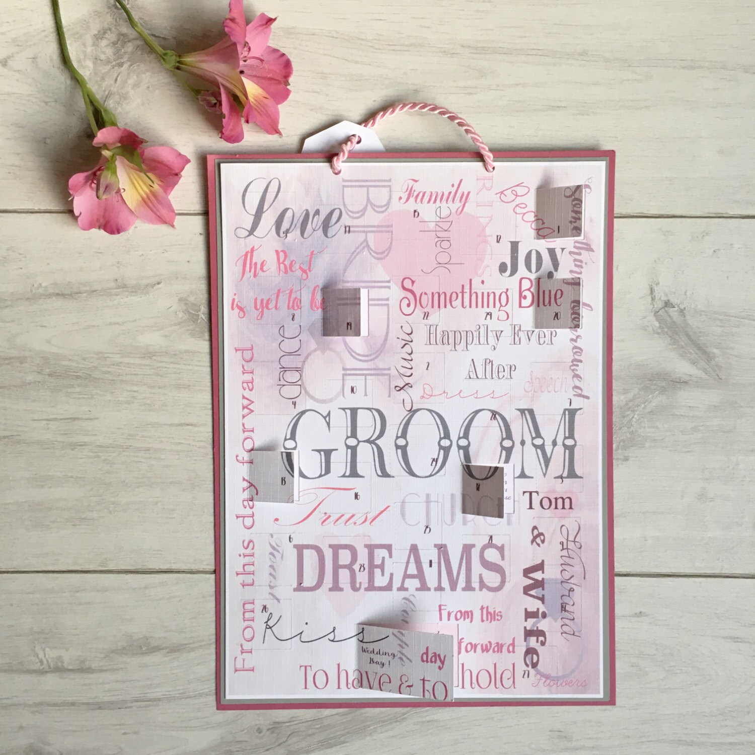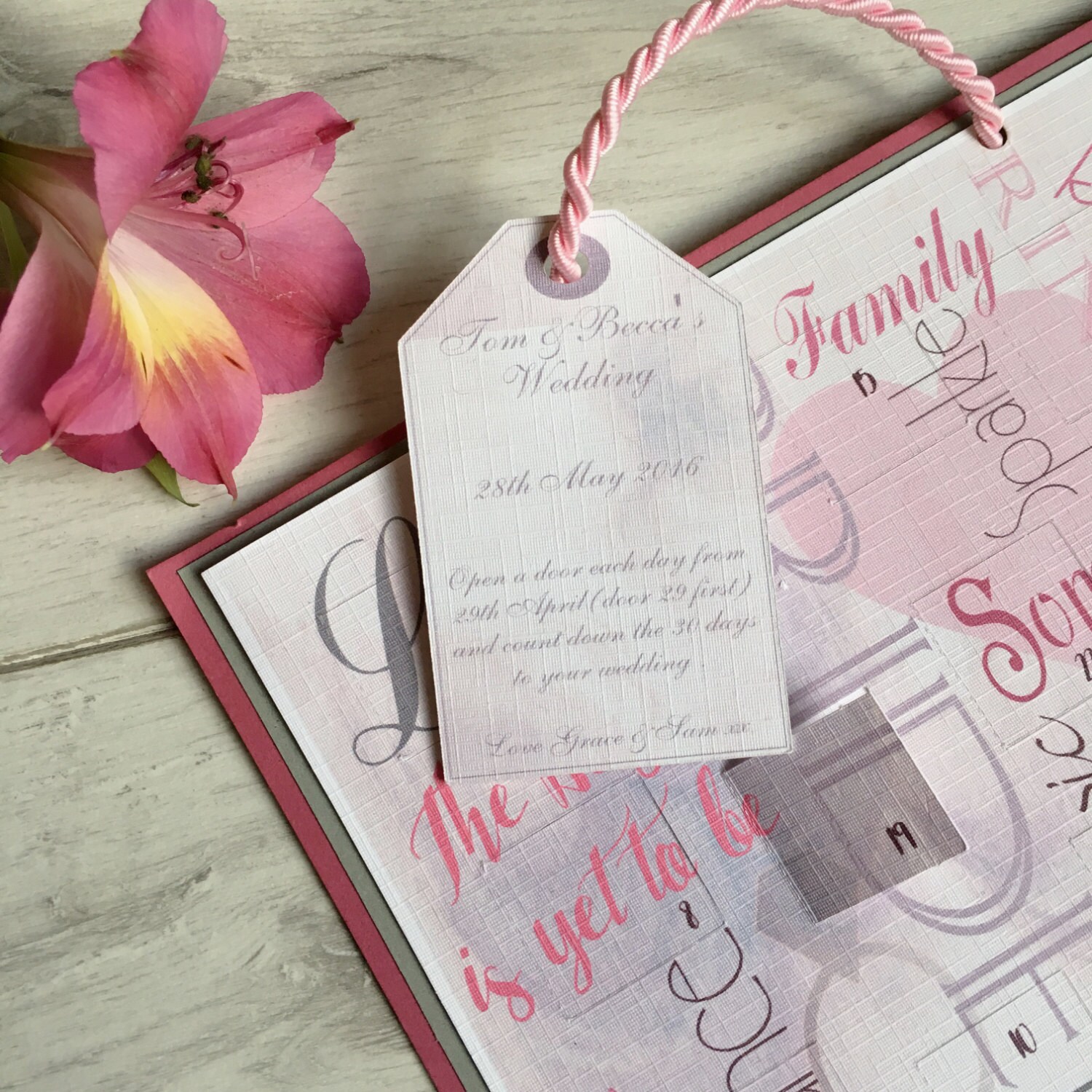Printed on luxurious 300gsm Linen Cardstock, and backed onto colour complimenting card measuring approximately 21cm x 29cm with a colour coordinated silk rope to use to hang the calendar with a little luggage tag with bride & grooms name and date of the wedding.