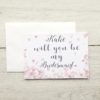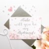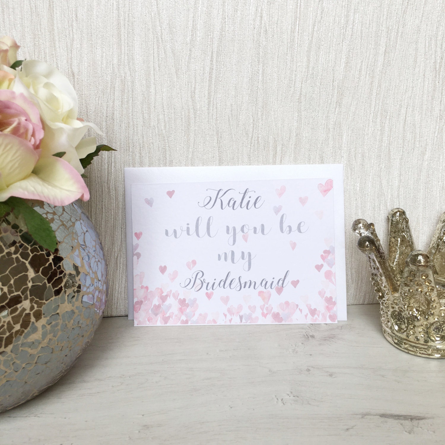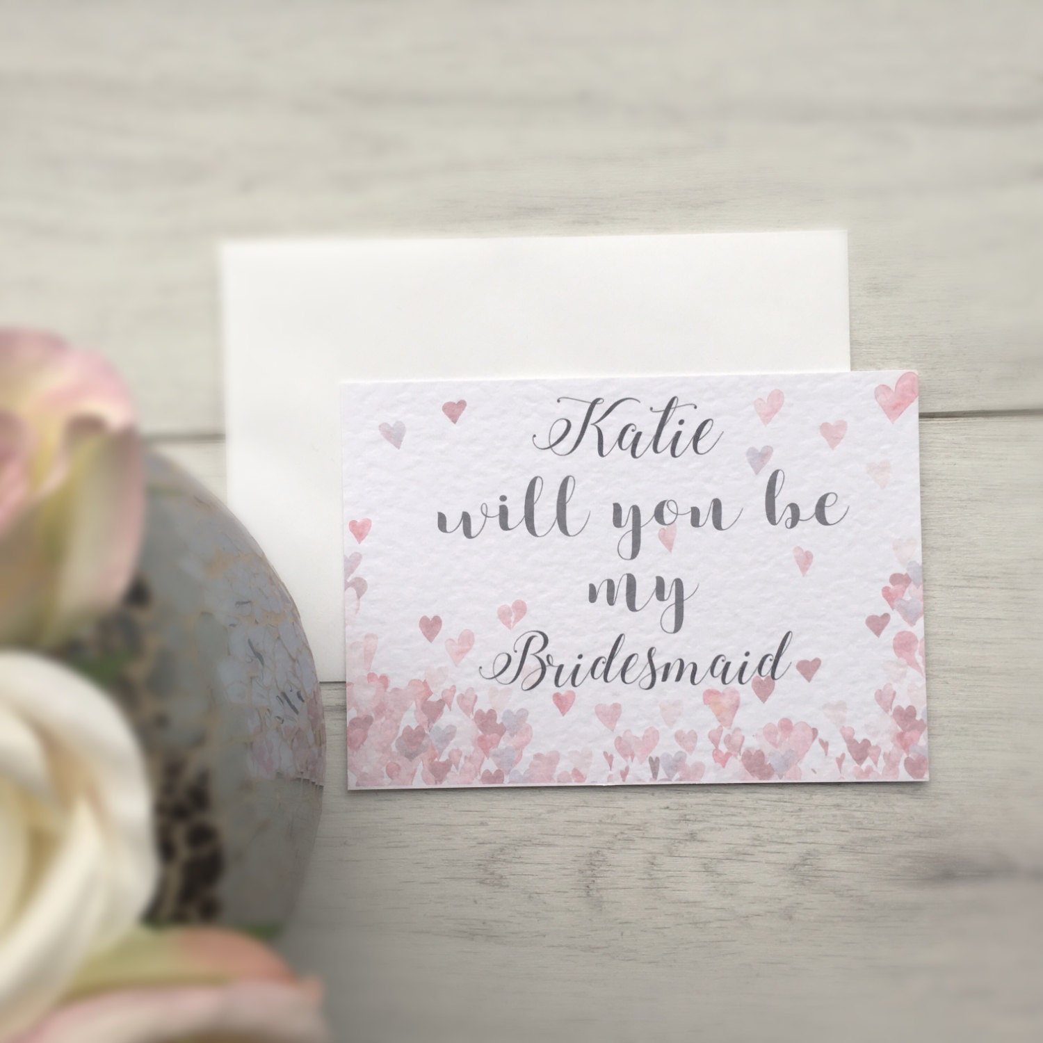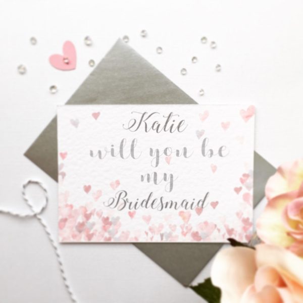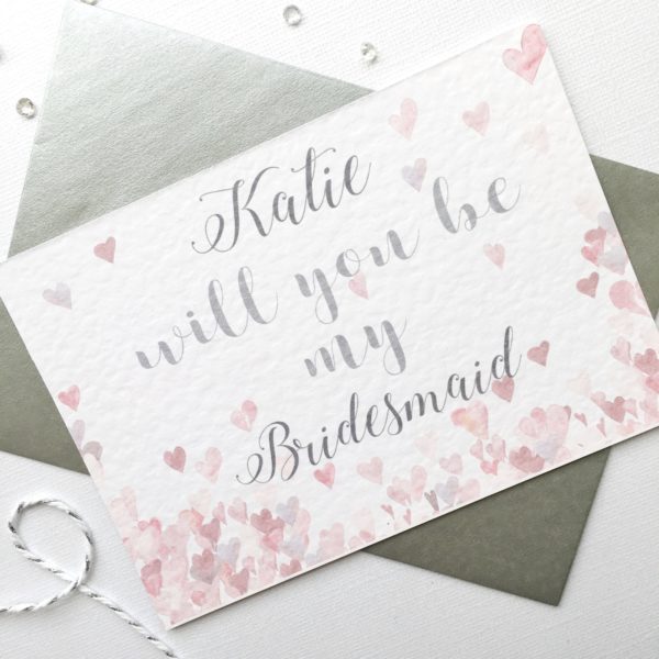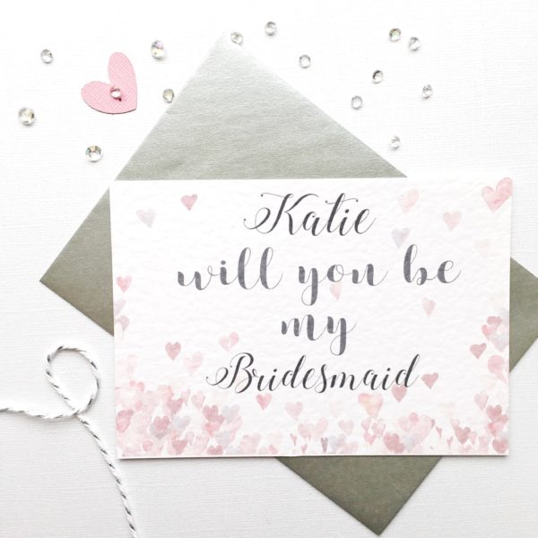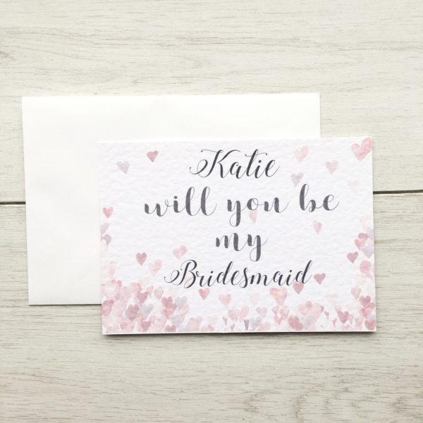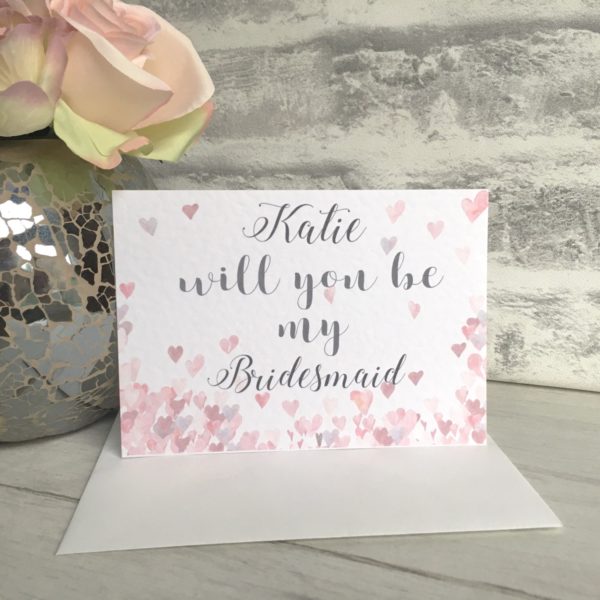 A beautiful personalised Will You Be Card Bridesmaid Invite with your bridesmaid to be’s name with a waterfall of hearts in shades of pinks and lilac’s.